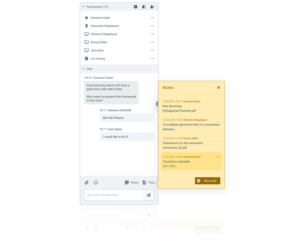 Participants can communicate messages to the larger group in the group chat, or switch to a one-on-one Chat window to message an individual participant privately. By using the Shared Notes feature, shared or personal notes can be created, exported, or saved during an online class or lecture. Shared Notes are visible to the entire group.