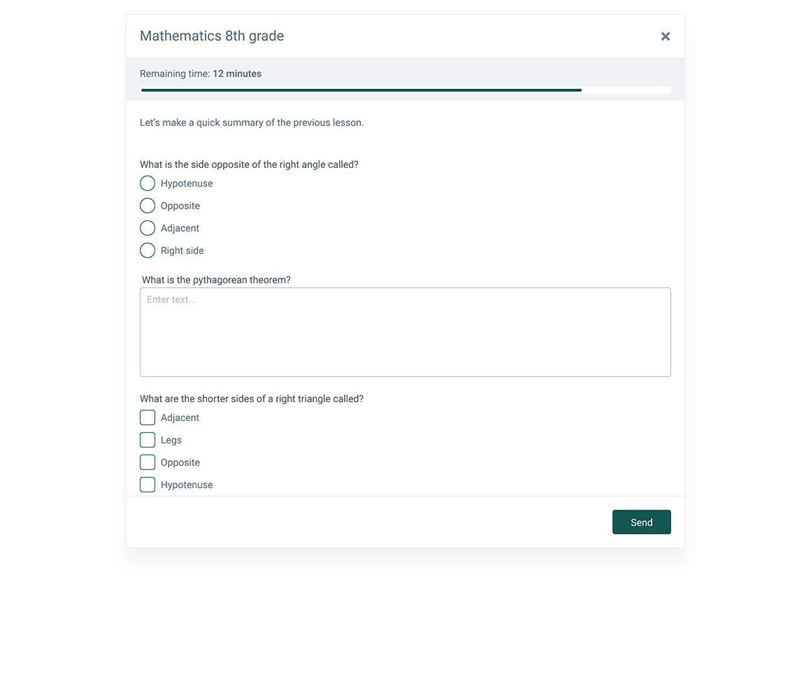Instructors can create surveys and quizzes, which students can fill out in real time during an online class or lecture. Choose between a variety of question formats, such as true/false, fill-in-the blank, free text and multiple choice.