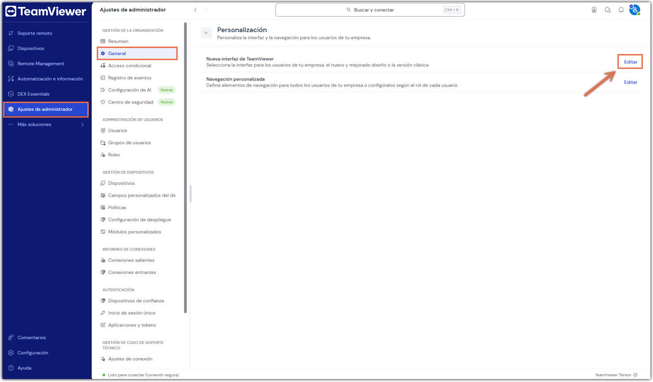 La nueva interfaz de usuario (UI) de TeamViewer Tensor ofrece una experiencia moderna y optimizada para el acceso y asistencia remotos. Para garantizar la coherencia en toda la organización, los administradores de la empresa pueden habilitar o aplicar la nueva interfaz de usuario para todos los usuarios, incluso en dispositivos que no se administran de forma centralizada.