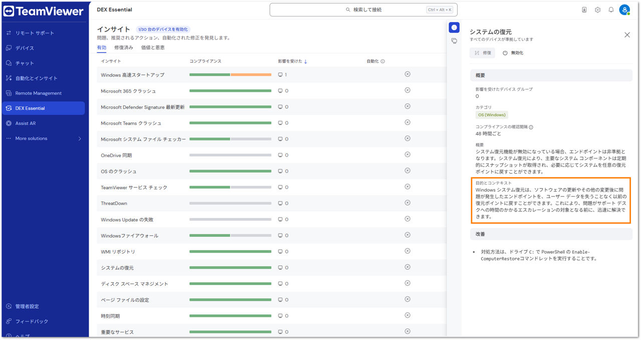 システムの復元 は、エンドポイントでシステムの復元機能がアクティブ化されていることを確認します。