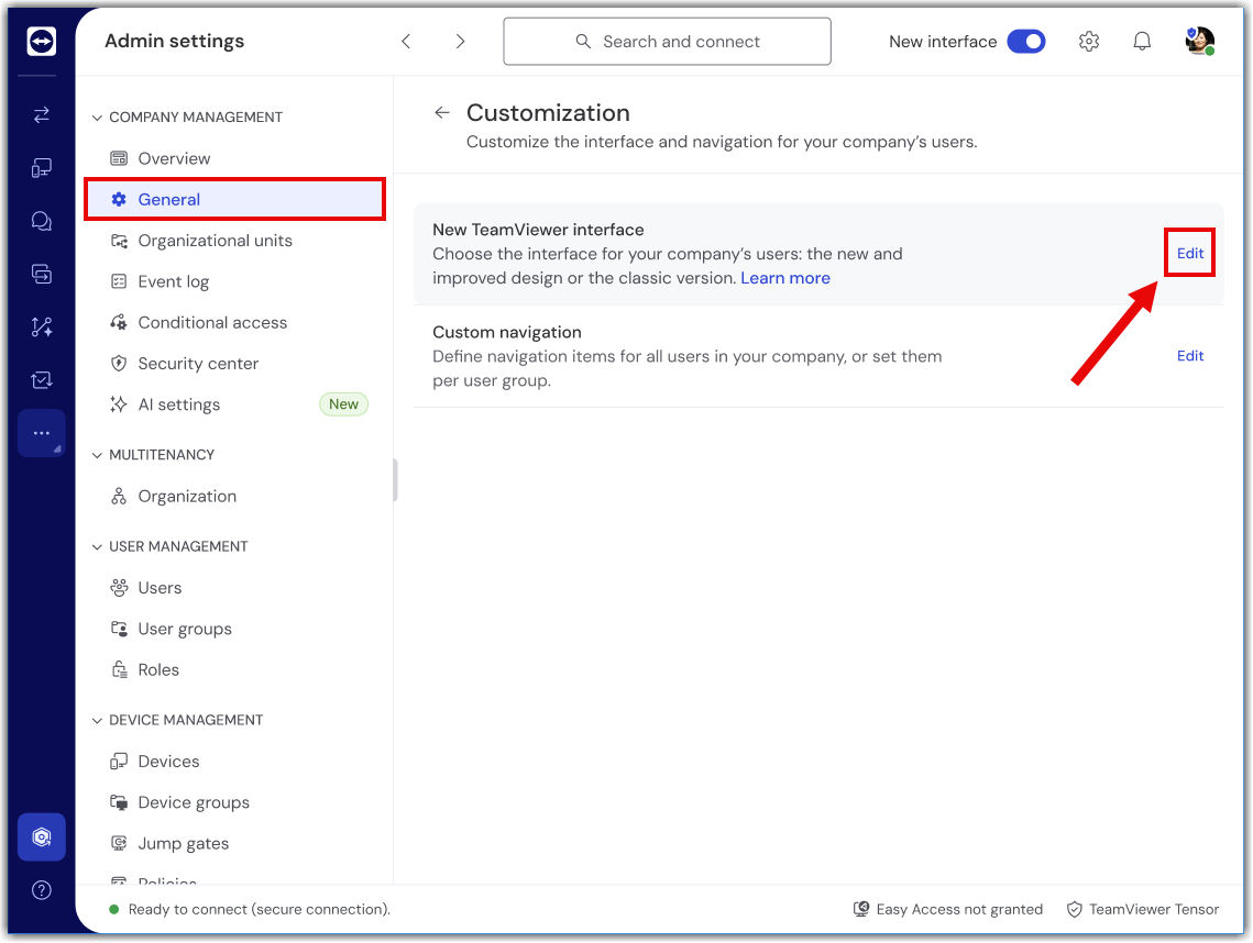 新しいTeamViewer Tensorユーザーインターフェイス (UI) は、リモートアクセスとサポートのためのモダンで合理化された体験を提供します。組織全体の一貫性を確保するために、会社の管理者は、一元管理されていないデバイスであっても、すべてのユーザーに対して新しい UI を有効化(UIスイッチトグルを表示させる)または強制的に適用できます。