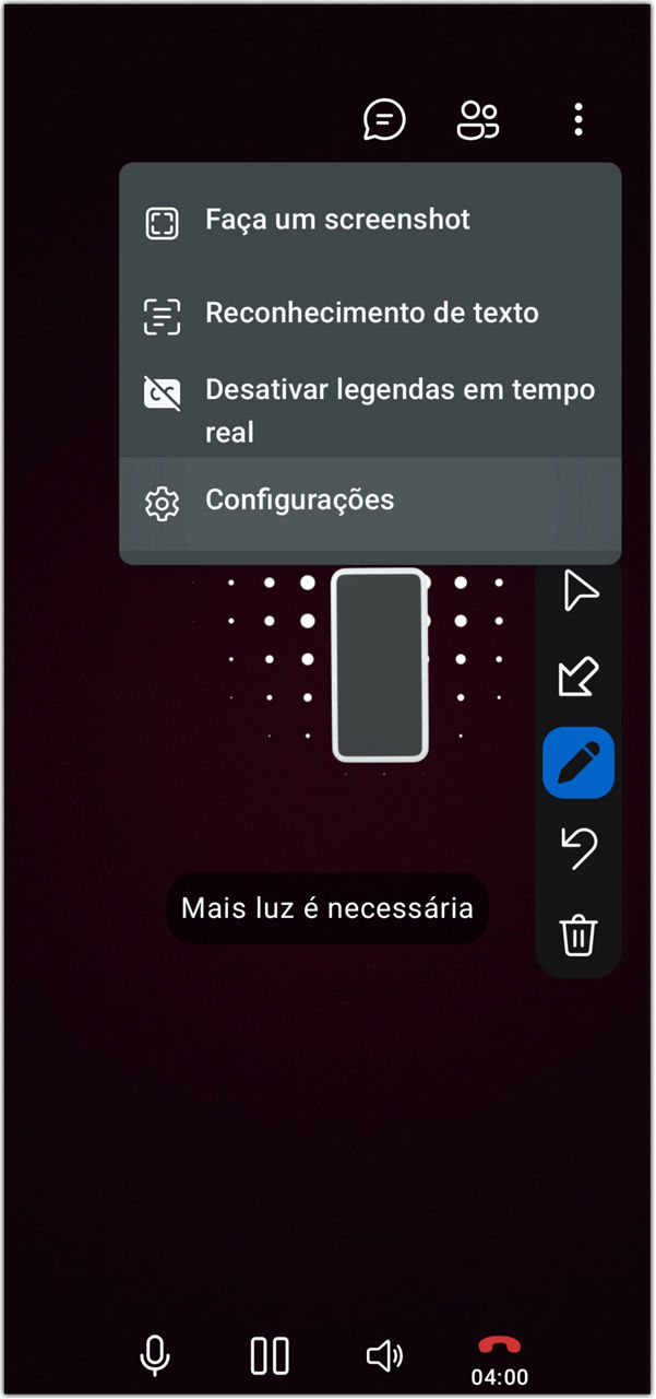 As configurações de legenda ao vivo e tradução podem ser configuradas a qualquer momento tocando no menu de três pontos (⋮) no canto superior direito.