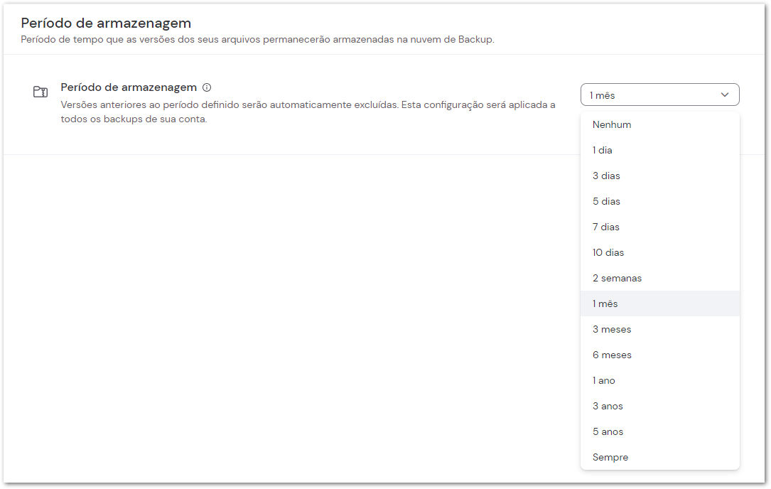 O período de armazenagem determina por quanto tempo as versões dos arquivos em seu backup são mantidas. As versões anteriores ao período de tempo definido serão eliminadas automaticamente. Para definir o período de armazenagem de todos os backups, selecione Período de armazenagem abaixo de Backup quando estiver na guia Gerenciamento remoto. No lado direito, clique no menu suspenso para selecionar o período de tempo desejado.