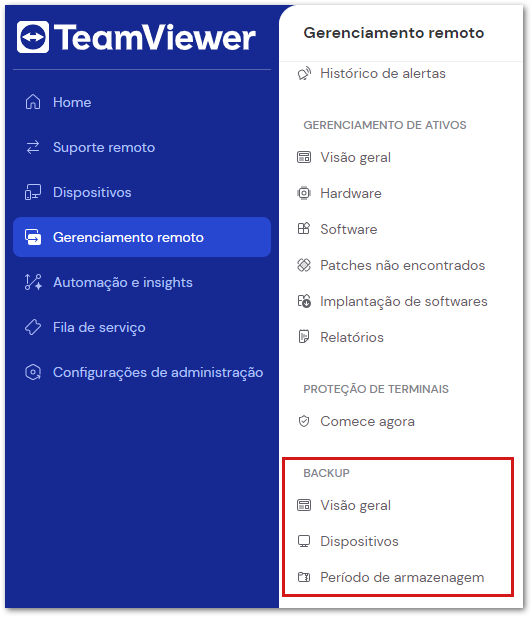 O TeamViewer Backup pode ser acessado no TeamViewer Remote ou por meio do web app na guia Gerenciamento remoto.