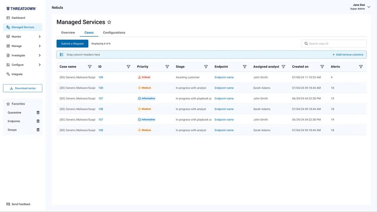 The Managed Detection and Response (MDR) Portal manages all aspects of the service. It can be accessed by selecting the Nebula button, which can be found in settings or the detections tab. Once in Nebula, select Managed Services to see all Cases and Incidents reported.
